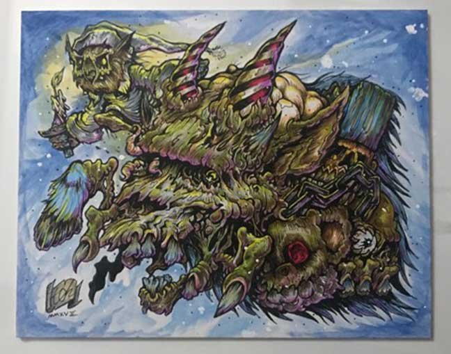 “Peppermint And Consequences” micron pen, copic markers, molotows, acrylic wash $300