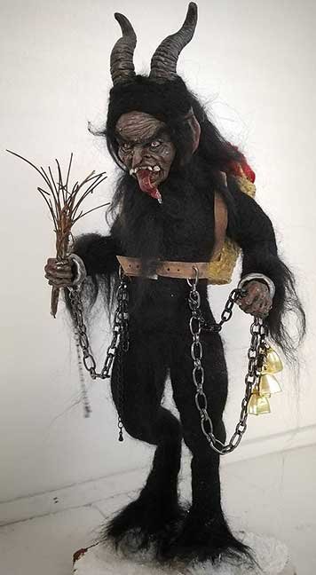 “The Naughty List” hand felted black wool body, epoxy clay sculpted face, hands, horns, child and feet, wooden base (12”) $450