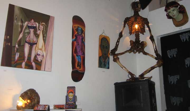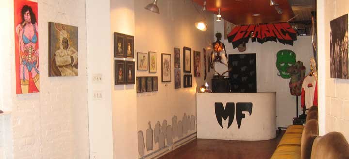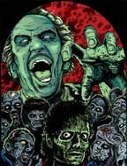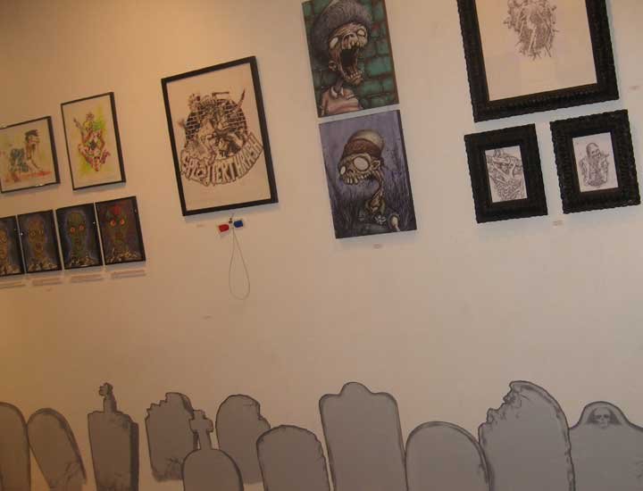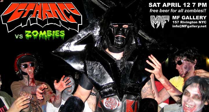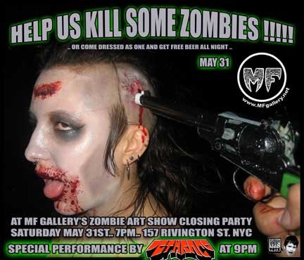 ATTACK AGAIN !!! Prepare to be attacked once again on April 12, when the hideous hordes of twisted ghouls will descend upon us, and hopefully be extinguished once and for all by the Zombie Slayers, Dethrace. A Band of Satanic Superhero Robots, Dethrace is a mix of Speed Metal and Crazy Performance Art. On opening night, they will deliver a Deadly 2000 Megawatt Metal Performance that will will shred the eardrums of all present, and blast these braineaters back to their tombs, allowing mankind to go back to its miserable existence… but for how long? MF Gallery's latest Zombie Show will be full of Gruesome Artwork by the likes of: Jeff McMillan, Mike Bell, Mark Riddick, Ghoulish Gary, Kristen Flaherty, Frank Russo, Putrid, James Wrona, Jeff Zornow, Dennis Dread, Lou Rusconi, Jaz Harold, Lawrence Van Abbema, Garry Boake, Drew Maillard, Martina Secondo Russo, Fernando Carpaneda, Moses D. Jaen Chris Warner, Chantal Smith, Anthony Alexander, The Ed Gein Collection & More. The Opening Party will be on Saturday, April 12, from 7 to 10 pm. Anyone who shows up in Zombie makeup will be given unlimited beer and brains all night! Admission is free and open to all ages, no RSVP required… BUT ENTER AT YOUR OWN RISK!! MF