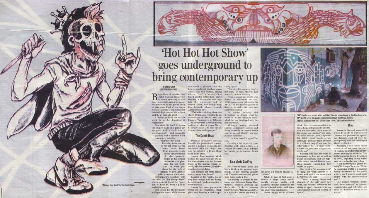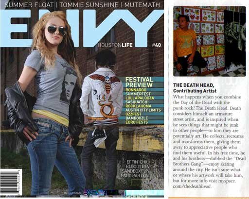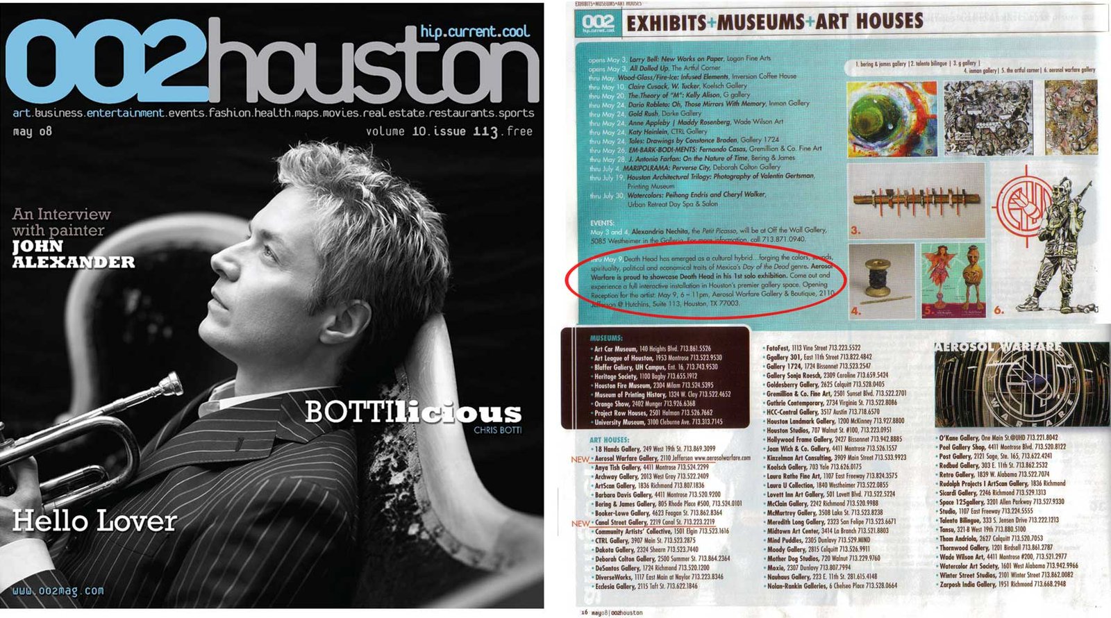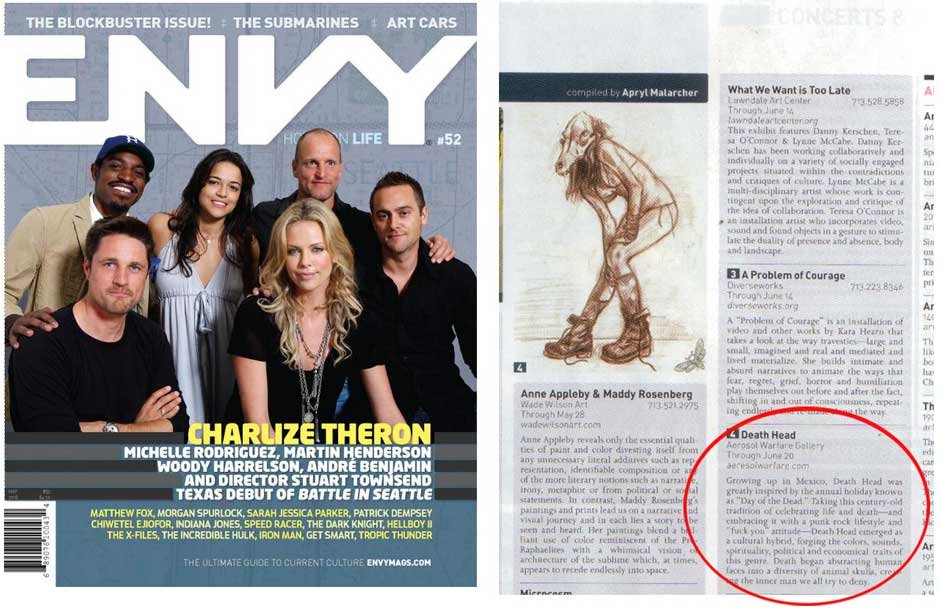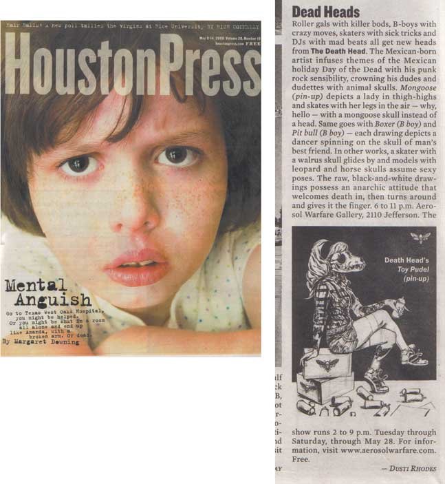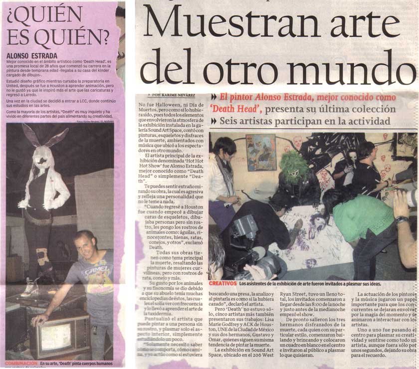 PRESS: Graffiti All Stars Magazine (issue 7- 2009) La Spirale Magazine (ezine- April 3, 2009) CASE Magazine (issue 3- 2008) Houston Press (issue 52- 2008) Envy Magazine (issue 19- 2008) Laredo Morning Times (July 25, 2008) 002 Houston Magazine (issue 11- 2008) El Manana Laredo (July 30, 2008) Envy